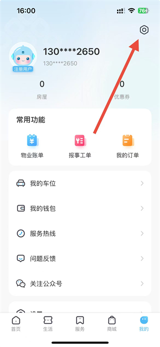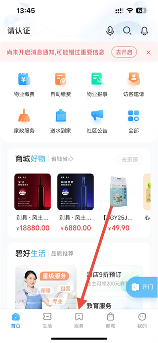 1、在首頁點擊底部服務(wù)選項,進(jìn)入含認(rèn)證業(yè)主功能的頁面。