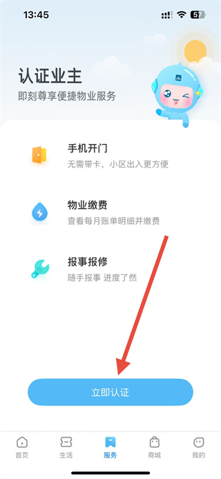 2、在服務(wù)頁面,點擊立即認(rèn)證按鈕,進(jìn)入業(yè)主認(rèn)證的信息填寫界面。