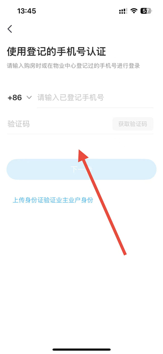 3、在認(rèn)證界面,輸入購房或物業(yè)登記的手機(jī)號,獲取并填寫驗證碼,完成業(yè)主身份的認(rèn)證流程。