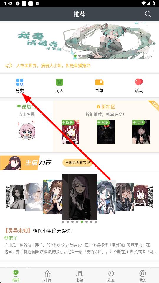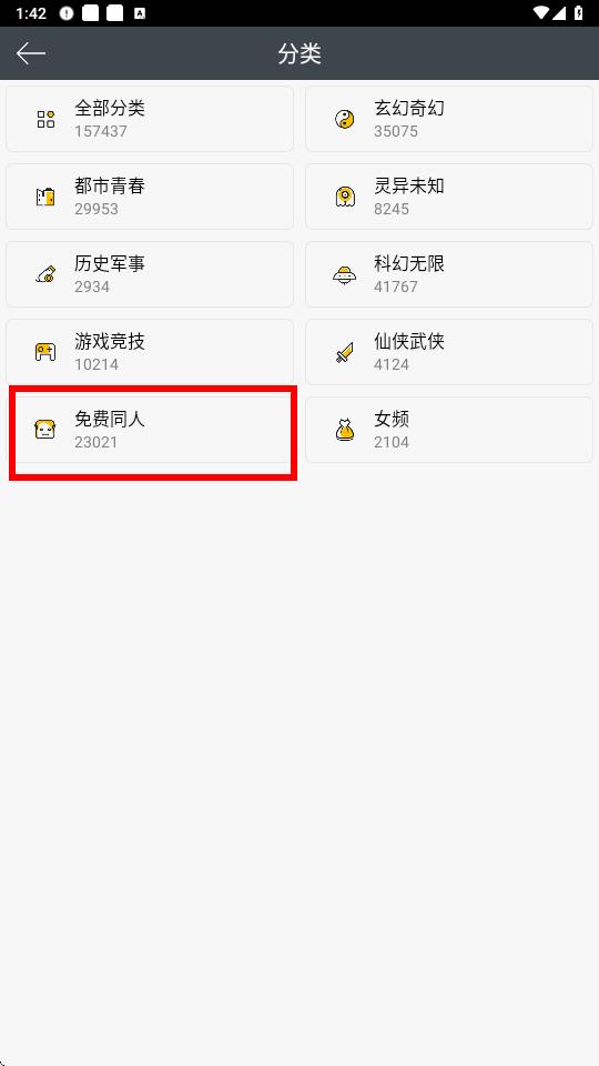 2、進(jìn)入分類頁(yè)面后,找到并點(diǎn)擊免費(fèi)同人分類。