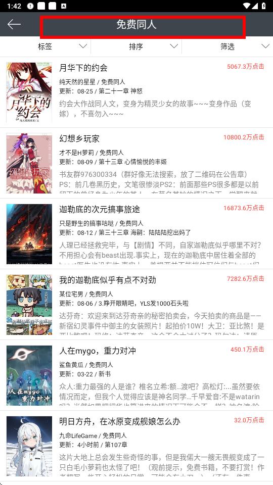 3、在免費(fèi)同人頁(yè)面,即可瀏覽免費(fèi)小說(shuō),選擇感興趣的小說(shuō)閱讀。