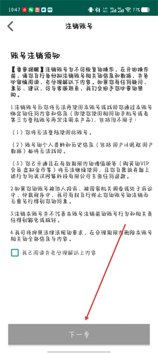3、在賬號注銷頁面,點(diǎn)擊下一步按鈕。