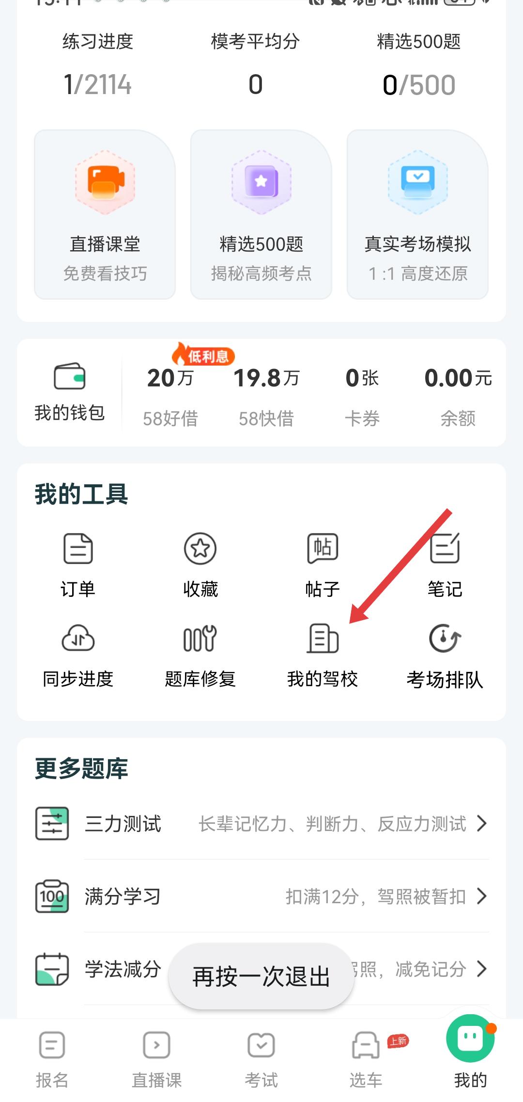 1、打開駕校一點(diǎn)通APP,進(jìn)入我的頁面,在我的工具區(qū)域點(diǎn)擊我的駕校,進(jìn)入綁定駕校界面。