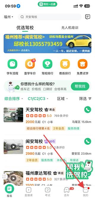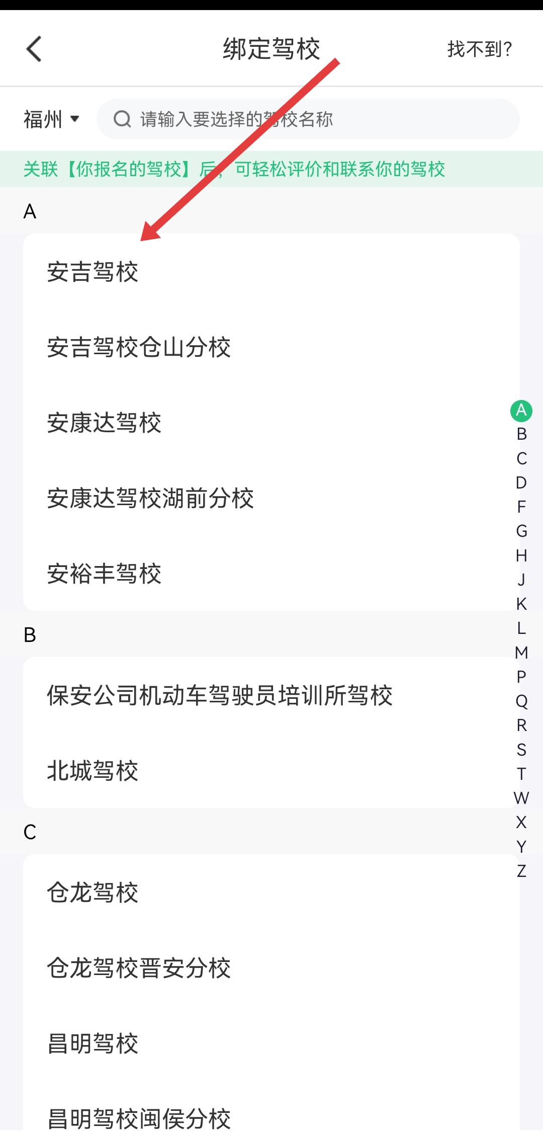 2、在綁定駕校頁面,從列表中選擇要評價的駕校如示例中的安吉駕校,進(jìn)入該駕校詳情頁。