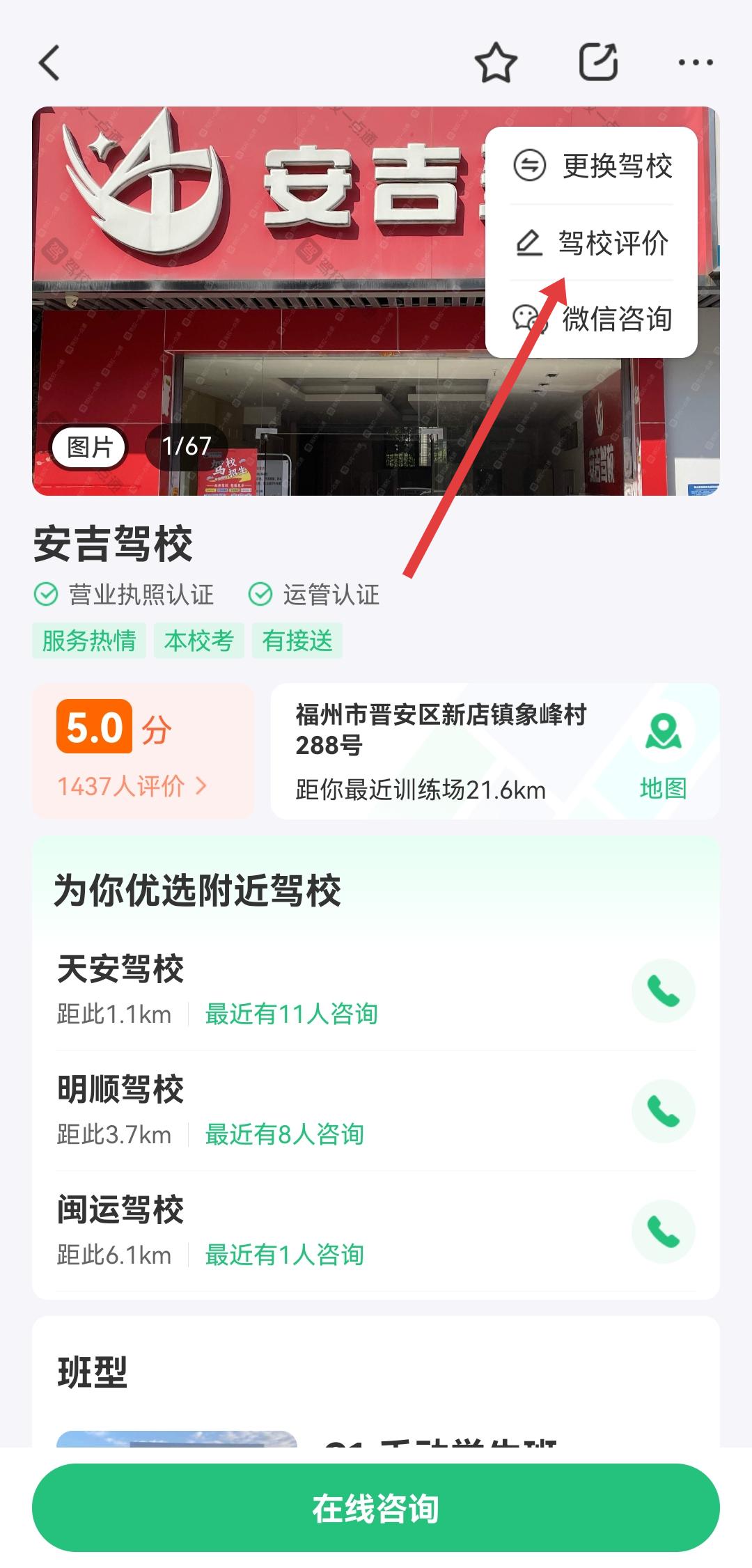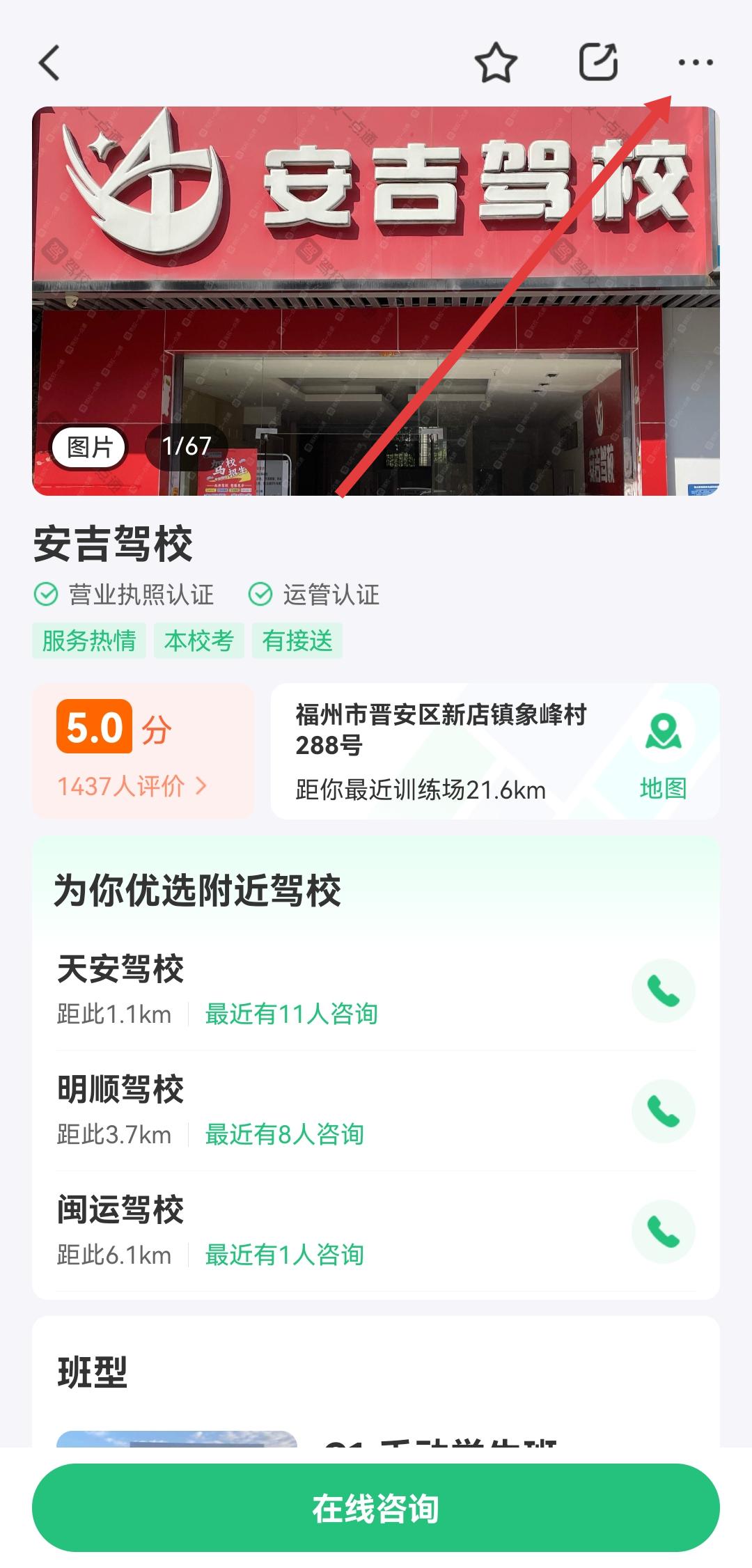 3、在駕校詳情頁面,點(diǎn)擊右上角的三點(diǎn)菜單按鈕,調(diào)出評價的選項(xiàng)。