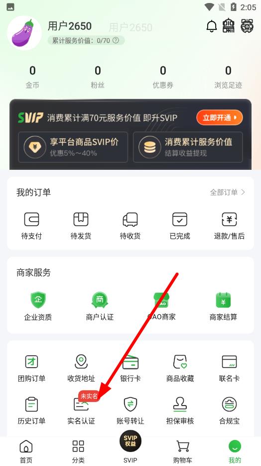 2、在我的頁(yè)面中下滑找到實(shí)名認(rèn)證選項(xiàng),點(diǎn)擊進(jìn)入實(shí)名認(rèn)證界面。