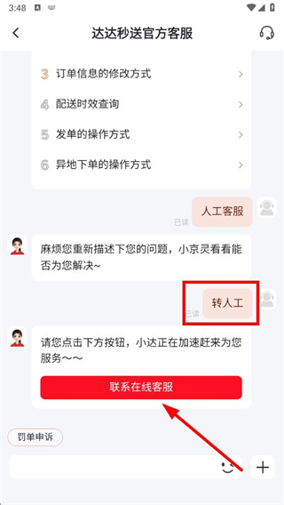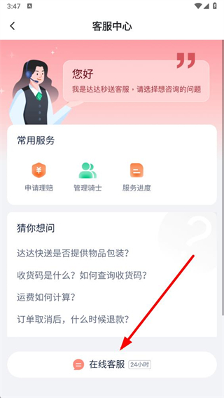 3、在客服中心頁面點擊在線客服按鈕,進入達達秒送官方客服對話頁面。