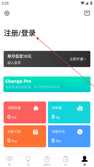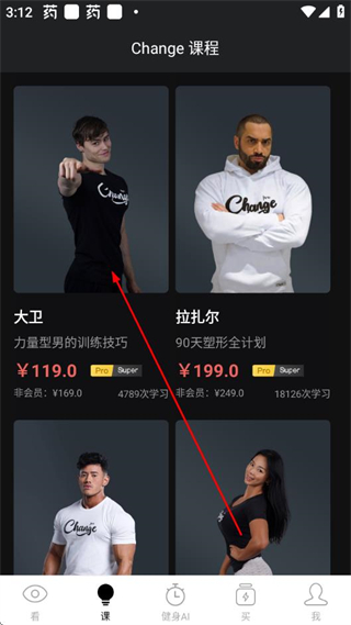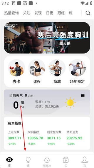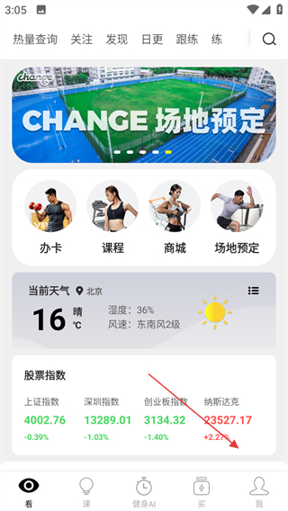 1、打開Change健身APP,點擊底部課選項,進入課程頁面。