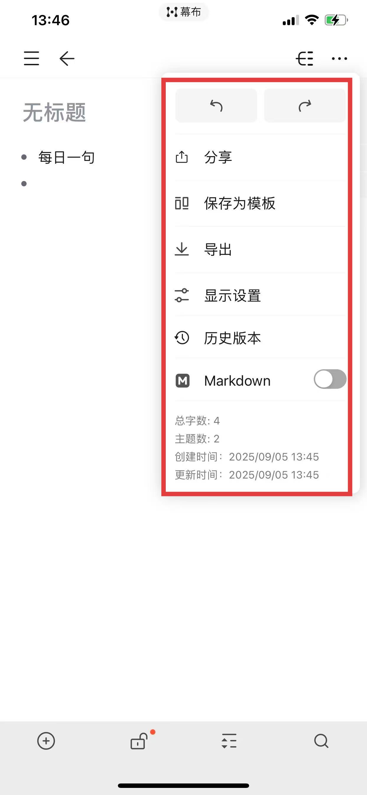 4、內(nèi)容編輯完成后,可進(jìn)行分享、保存為模板、導(dǎo)出等操作,也能查看文檔總字?jǐn)?shù)、主題數(shù)等信息。