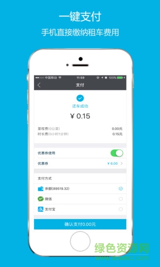 5、還車,到達(dá)目的地后,到指定網(wǎng)點(diǎn)點(diǎn)擊按鈕“還車”,支付費(fèi)用并結(jié)束用車。