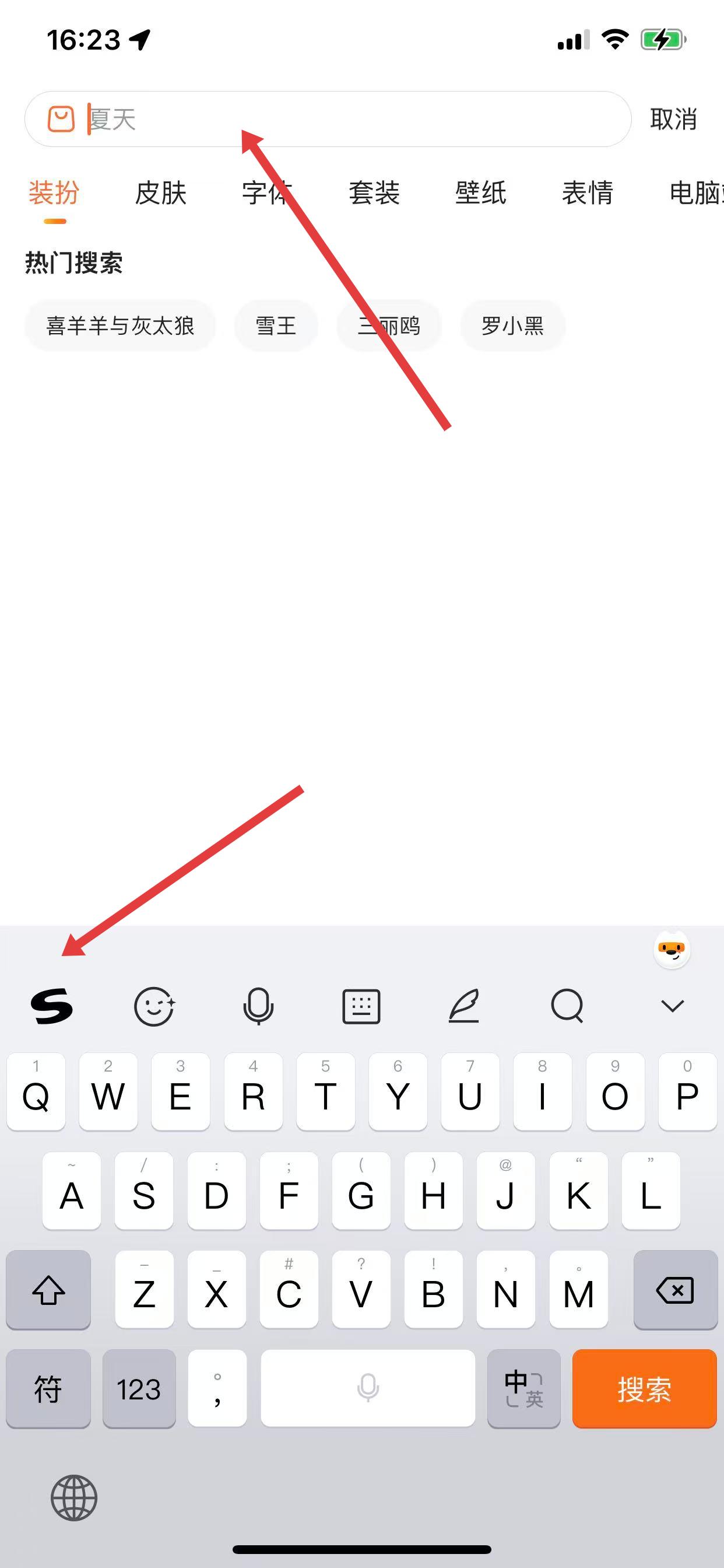 1、在手機(jī)界面調(diào)出搜狗輸入法鍵盤,點(diǎn)擊鍵盤左上角的S圖標(biāo),打開搜狗輸入法的功能菜單。
