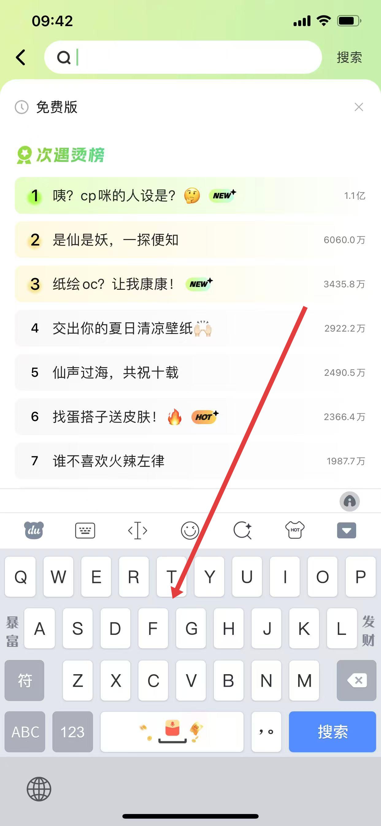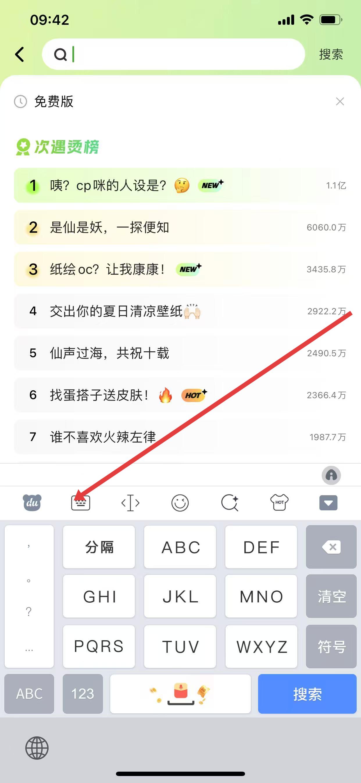 1、在百度輸入法輸入界面,點(diǎn)擊鍵盤上方類似鍵盤形狀的圖標(biāo),調(diào)出鍵盤模式選擇菜單。