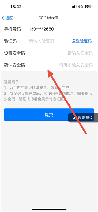 4、在頁面輸入驗(yàn)證碼,設(shè)置安全碼并確認(rèn)安全碼,點(diǎn)擊提交按鈕,即可完成安全碼設(shè)置操作。