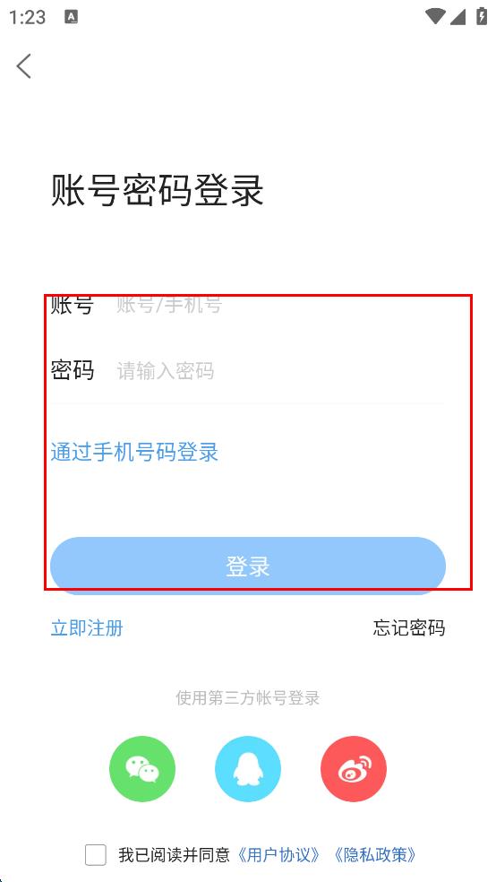 4、在賬號密碼登錄界面輸入賬號和密碼,勾選已閱讀并同意相關(guān)協(xié)議后點(diǎn)擊登錄,完成登錄操作。