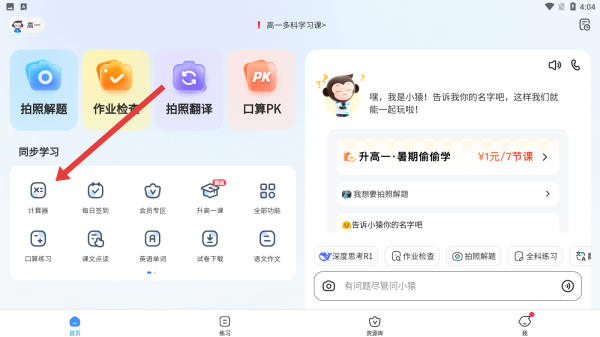 1、在APP首頁同步學習板塊,點擊計算器圖標,進入智能計算器界面,可輸入算式進行計算,開啟工具使用流程。