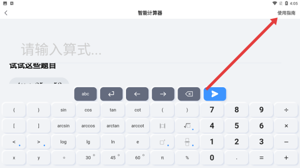 2、在智能計算器頁面,點擊右上角使用指南按鈕,跳轉至指南界面,查看計算器功能及按鍵操作使用說明。
