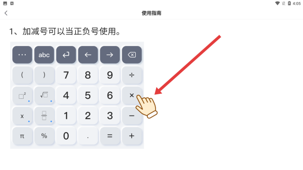 3、進入使用指南后,滑動屏幕瀏覽更多使用方法,查看加減號、乘號等按鍵的使用規(guī)則,全面掌握操作要點。
