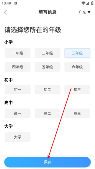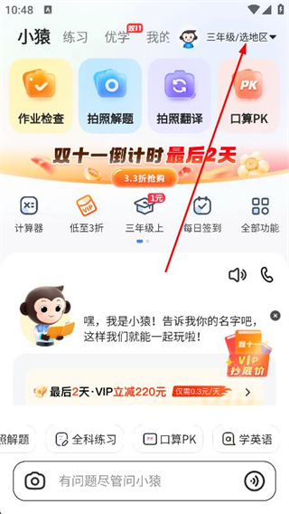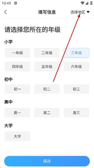1、打開小猿搜題APP,點擊右上角的三年級/選地區(qū)區(qū)域。