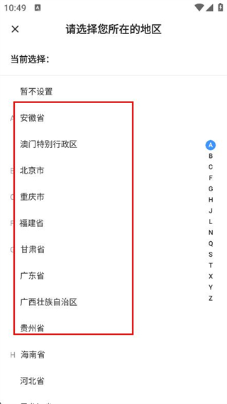 3、進入地區(qū)選擇頁面后,選擇所在的省份和對應的城市。