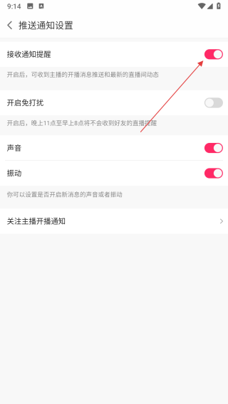 4、在推送通知設(shè)置頁面,點(diǎn)擊接收通知提醒右側(cè)的開關(guān)按鈕,將其關(guān)閉。