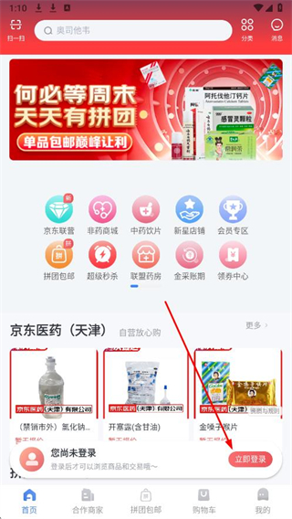 1、打開藥京采APP,在首頁點(diǎn)擊立即登錄。