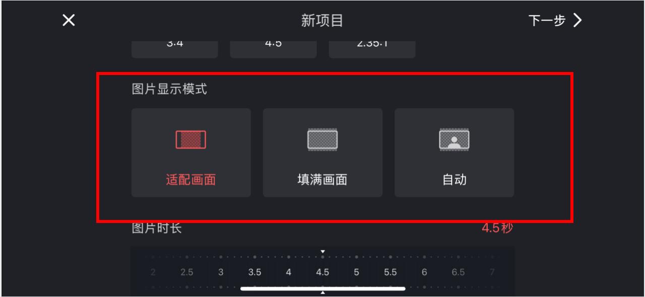 2、在新項(xiàng)目設(shè)置頁(yè)面中,找到圖片顯示模式選項(xiàng)區(qū)域,這里有適配畫(huà)面,填滿(mǎn)畫(huà)面,自動(dòng)等多種模式可供選擇。