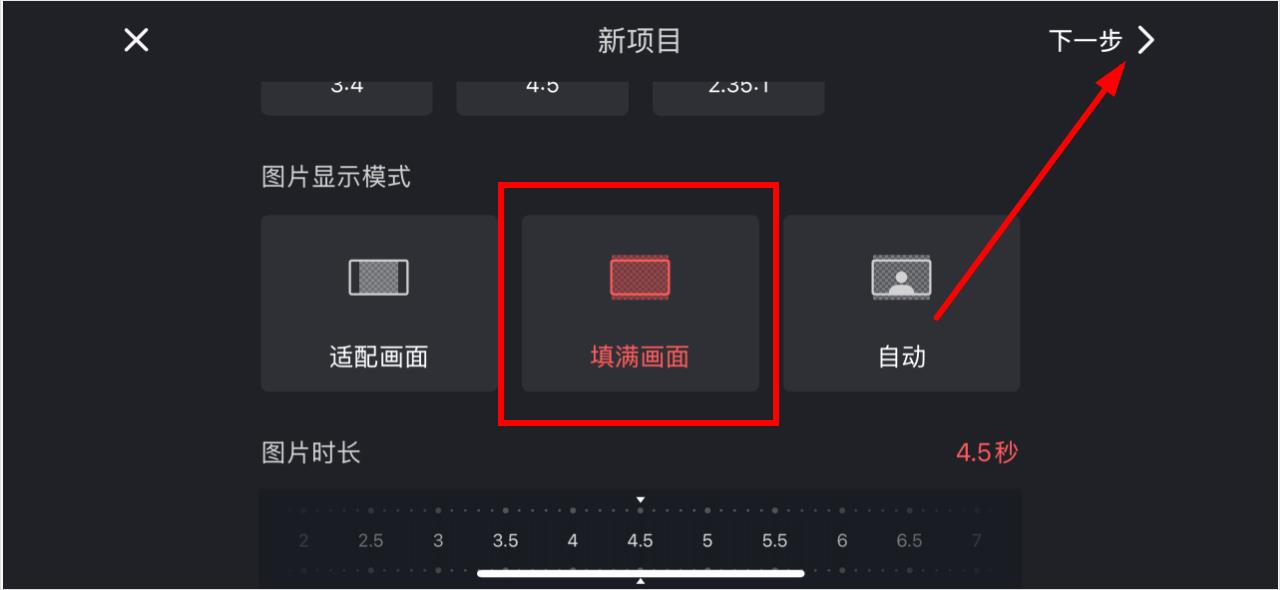 3、根據(jù)自己想要的圖片展示效果,點(diǎn)擊對(duì)應(yīng)的顯示模式選項(xiàng),比如選擇填滿(mǎn)畫(huà)面模式后,點(diǎn)擊頁(yè)面右上角下一步按鈕,即可按照所選模式對(duì)后續(xù)導(dǎo)入圖片進(jìn)行顯示設(shè)置。