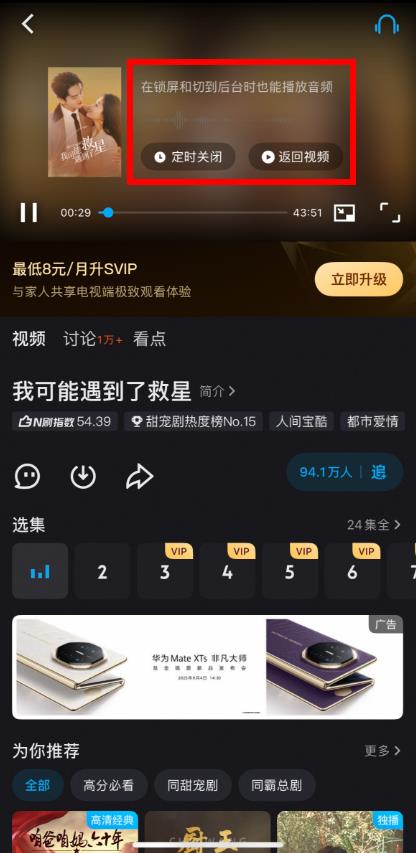 3、點(diǎn)擊后即可進(jìn)入音頻播放模式,此時(shí)在鎖屏和切到后臺(tái)時(shí)也能播放音頻,還可選擇定時(shí)關(guān)閉等操作。