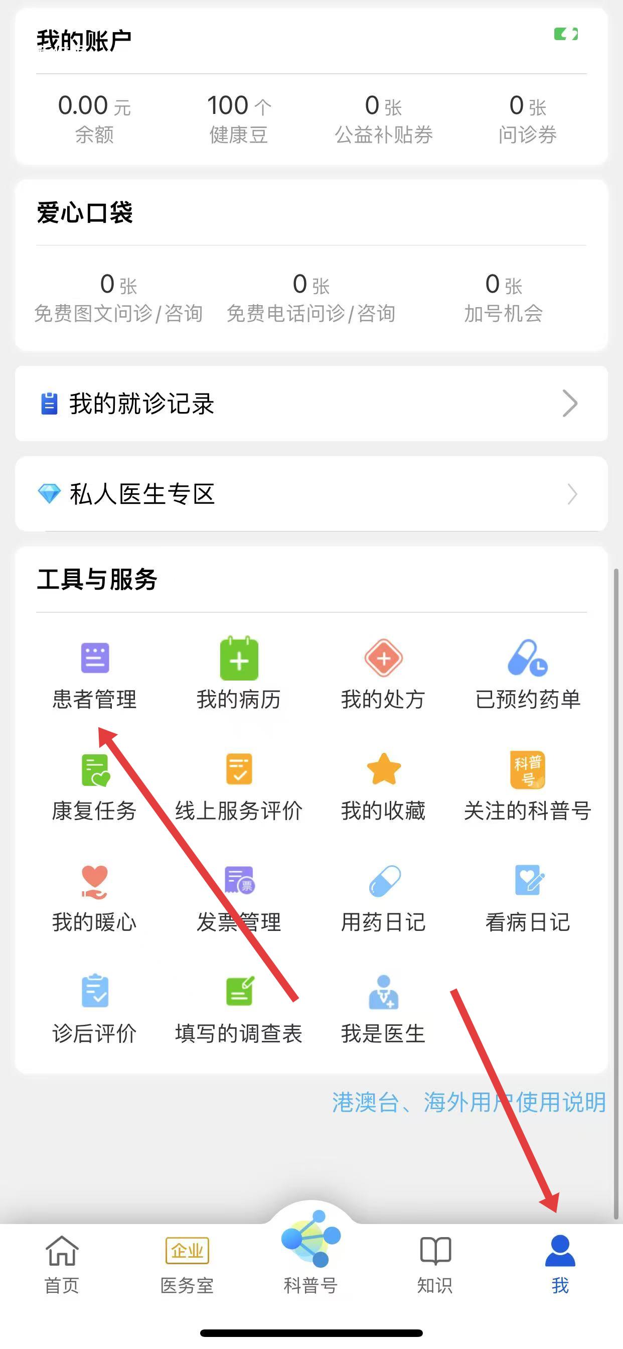1、打開好大夫在線APP,在個人中心頁面的工具與服務(wù)板塊中,點擊患者管理選項。