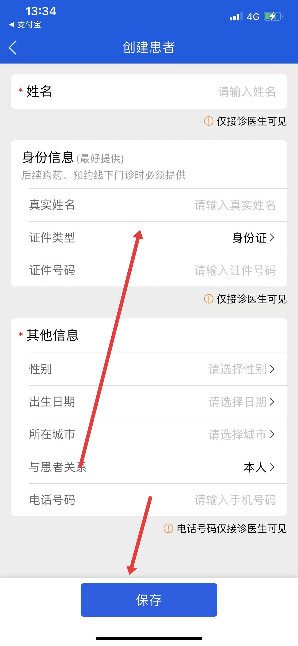 3、在創(chuàng)建患者頁面,依次填寫患者的姓名、身份信息、其他信息,點擊保存按鈕,即可成功添加患者信息。