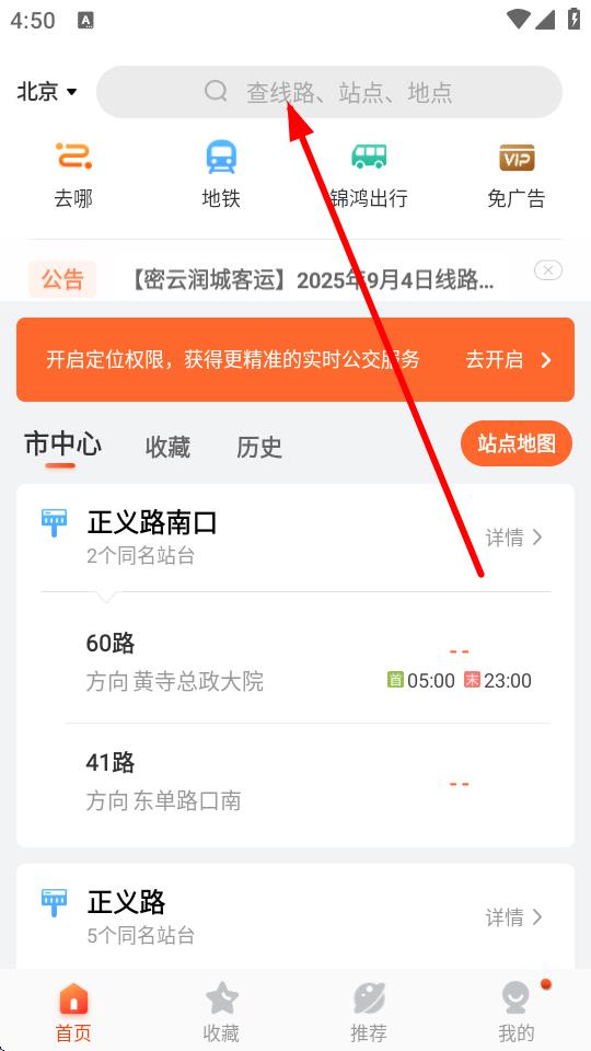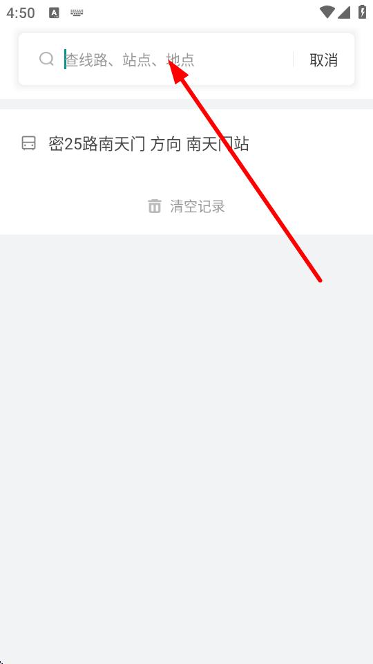 1、打開掌上公交,點(diǎn)擊首頁(yè)頂部查線路、站點(diǎn)、地點(diǎn)搜索欄。