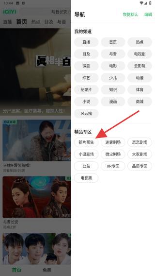 2、在展開(kāi)的導(dǎo)航欄中,找到并點(diǎn)擊新片預(yù)告的圖標(biāo)按鈕。