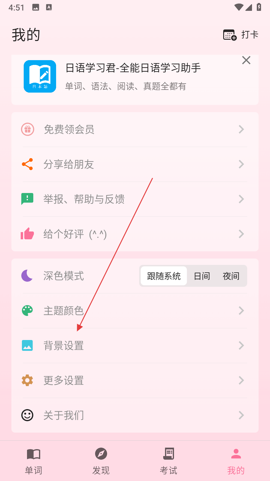 2、在我的頁面中,找到并點(diǎn)擊背景設(shè)置選項(xiàng),進(jìn)入背景設(shè)置界面。