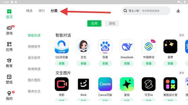 3、切換至分類(lèi)頁(yè)面,按游戲、工具、娛樂(lè)等類(lèi)別細(xì)分,逐級(jí)瀏覽對(duì)應(yīng)分類(lèi)下的應(yīng)用,高效篩選特定類(lèi)型資源。