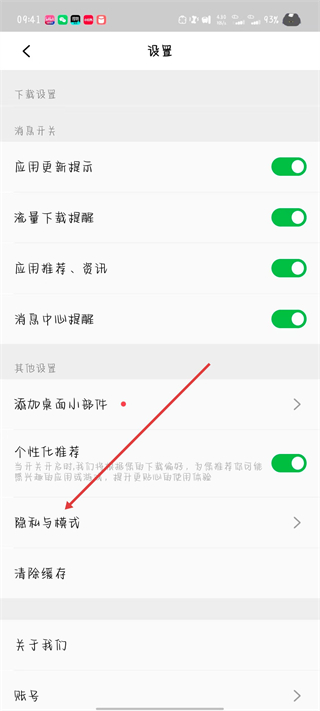 3、在設(shè)置頁(yè)面,找到并點(diǎn)擊隱私與模式選項(xiàng)。