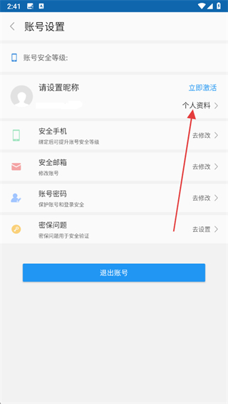 3、在賬號(hào)設(shè)置頁(yè)面,點(diǎn)擊個(gè)人資料選項(xiàng)。