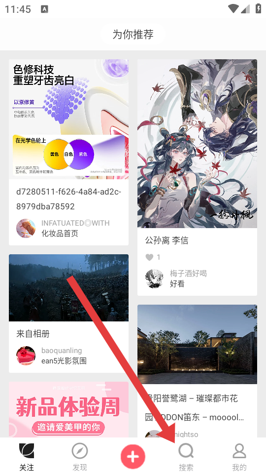 1、打開花瓣APP,需要點擊底部導(dǎo)航欄的搜索,進(jìn)入搜索的頁面。