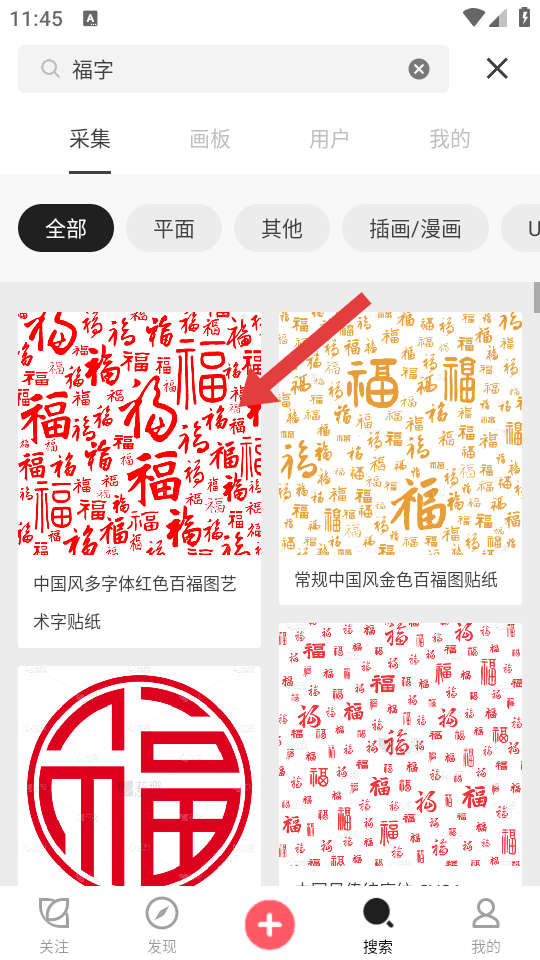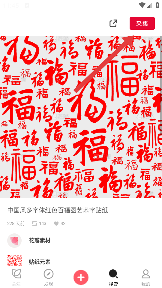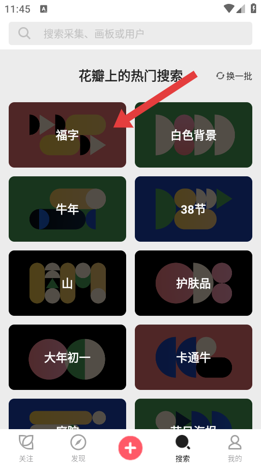 2、在花瓣上的熱門搜索區(qū)域,點擊想要采集的素材分類如福字,進(jìn)入素材搜索的結(jié)果頁。
