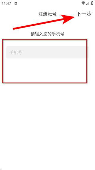 2、在注冊賬號頁面,輸入手機(jī)號后點擊下一步按鈕。