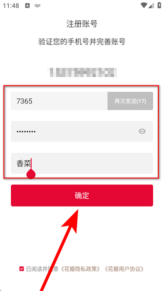 3、輸入收到的驗證碼,設(shè)置密碼并填寫昵稱,勾選已閱讀并同意相關(guān)協(xié)議后點擊確定按鈕。