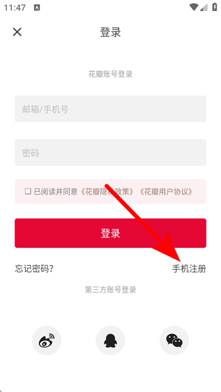 1、打開花瓣應(yīng)用,在登錄頁面點擊手機(jī)注冊選項。
