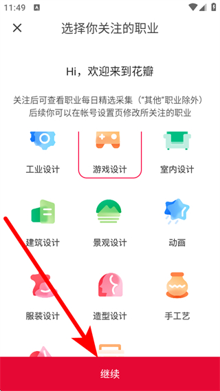 4、選擇關(guān)注的職業(yè)后點擊繼續(xù)按鈕,即可完成新賬號注冊操作。