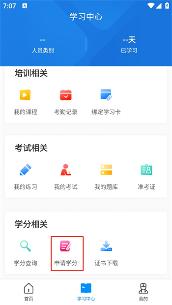 2、學(xué)習(xí)中心里面都是關(guān)于自己學(xué)習(xí)各方面的需求,下方的學(xué)分相關(guān)功能一欄中,找到中鍵的【申請學(xué)分】功能,但是在功能申請之前需要先登錄自己的賬號才可以使用這個功能;
