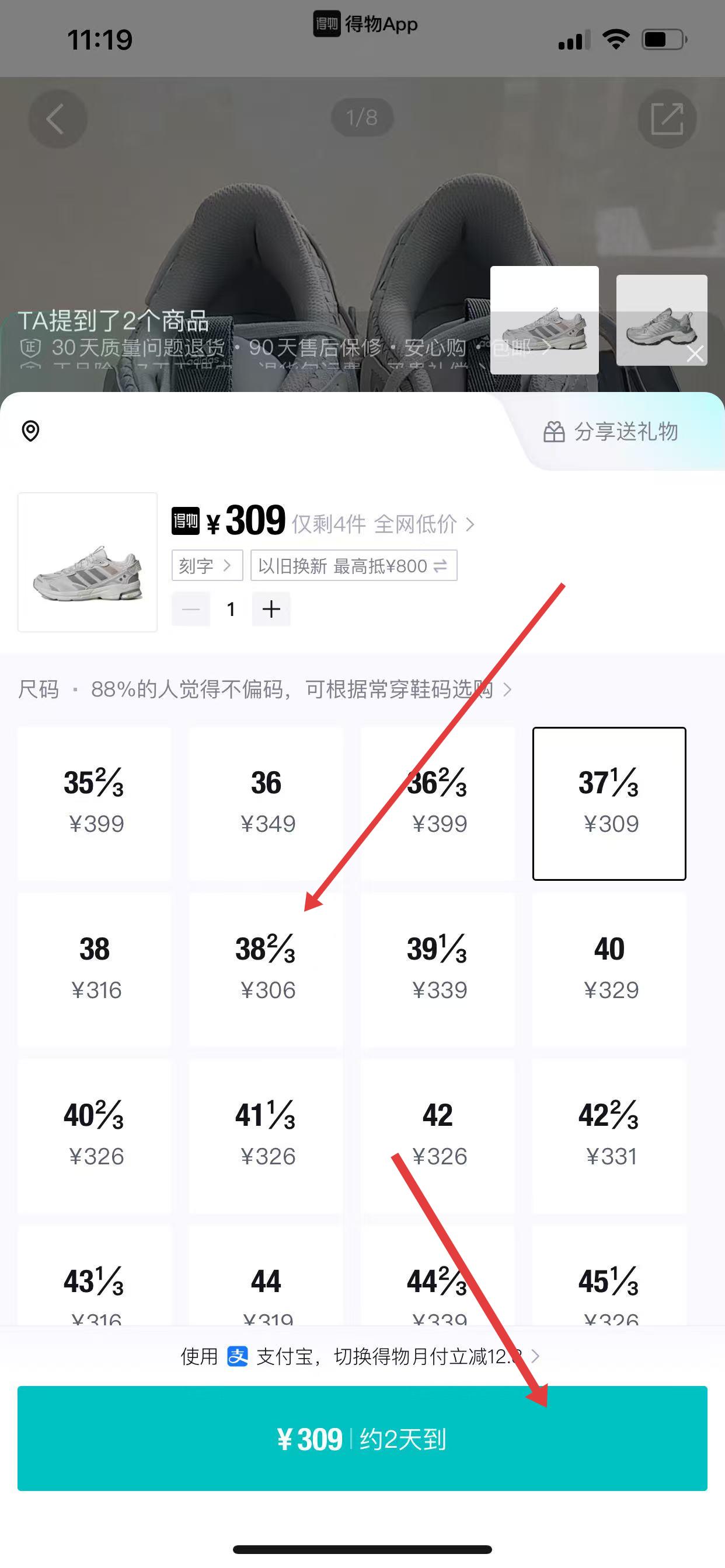 3、進(jìn)入購買頁面后,選擇商品的尺碼,點擊支付按鈕,即可完成購買。