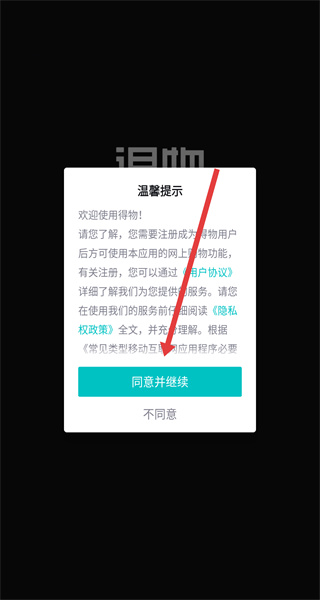 1、打開得物APP,彈出“溫馨提示”窗口,點擊“同意并繼續(xù)”。