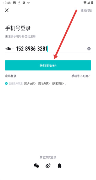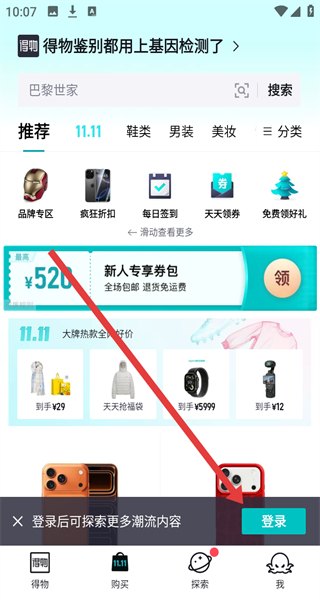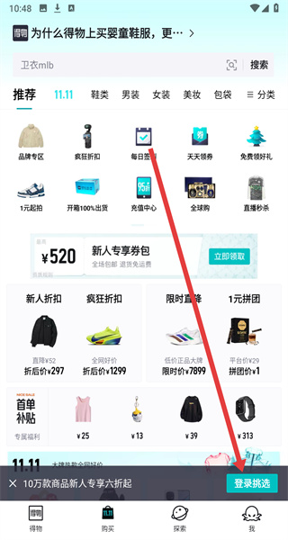 2、進(jìn)入得物首頁后,點擊登錄挑選按鈕,即可進(jìn)入手機(jī)號登錄頁面。