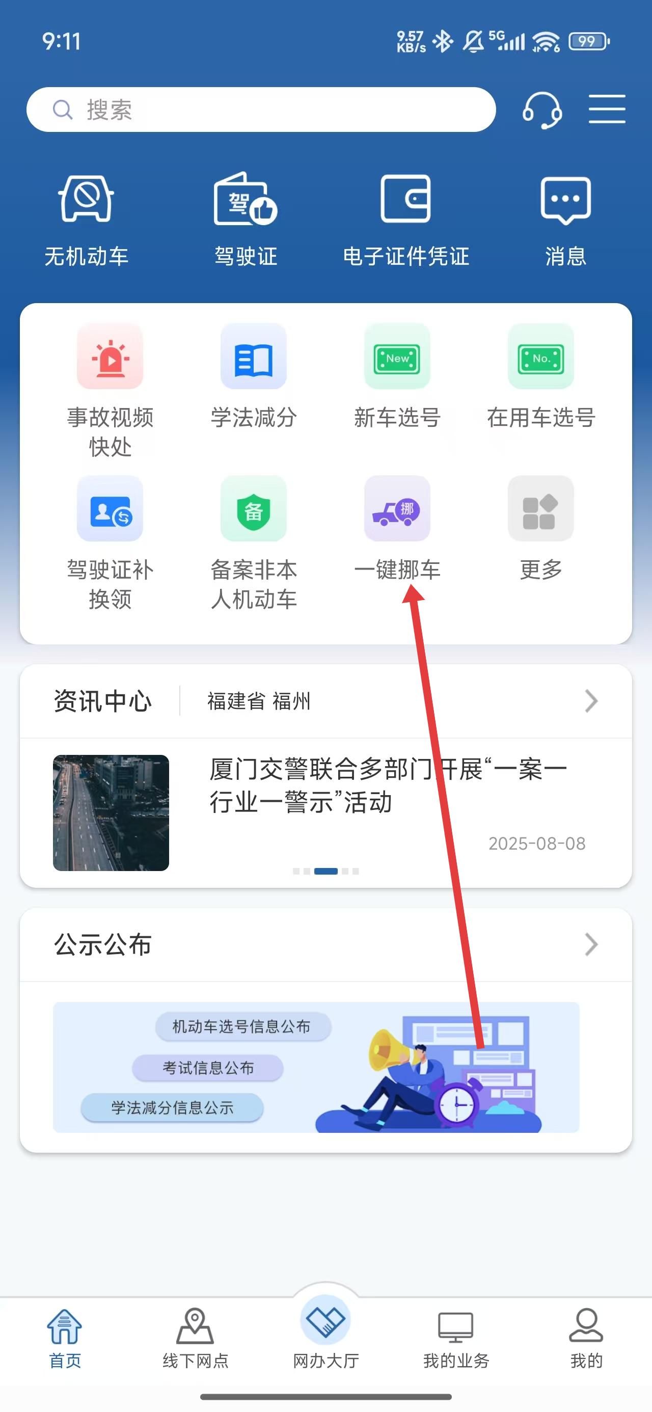 1、在交管12123首頁中,可以點擊一鍵挪車按鈕進(jìn)入查看相關(guān)功能。