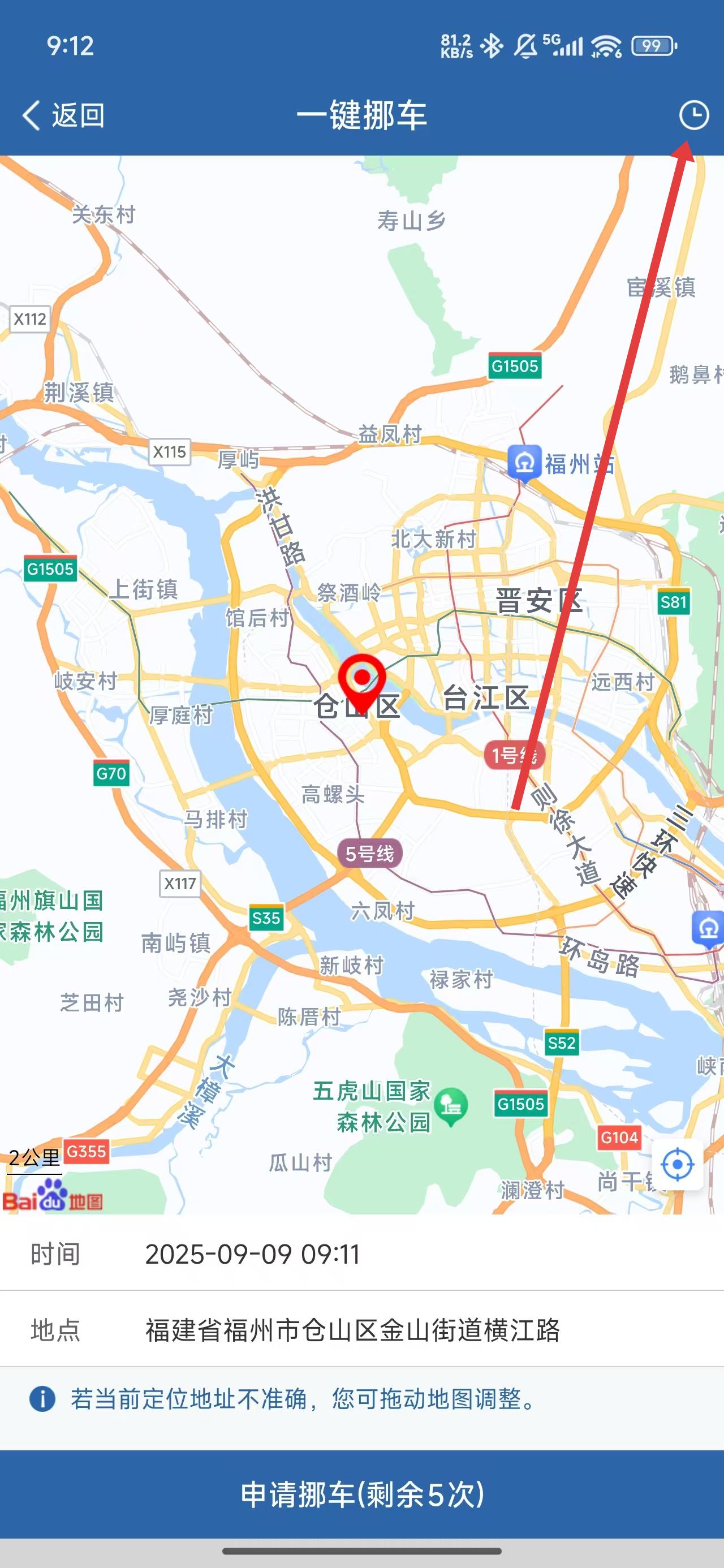 2、進(jìn)入到一鍵挪車頁面后,可以點擊右上方的時間圖標(biāo),進(jìn)入查看歷史記錄。