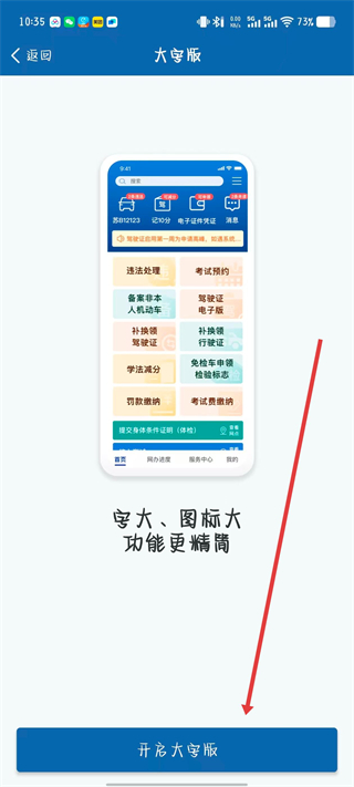 4、在大字版設(shè)置頁面點擊開啟大字版按鈕,即可開啟大字版。