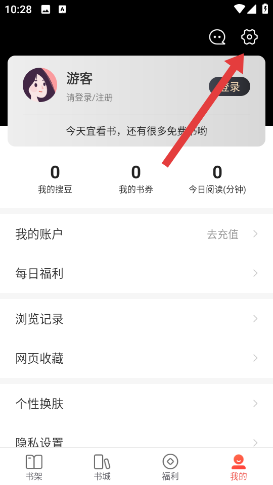 1、打開搜狗閱讀APP,進(jìn)入我的頁面,需要點(diǎn)擊右上角的設(shè)置圖標(biāo),進(jìn)入設(shè)置的界面。